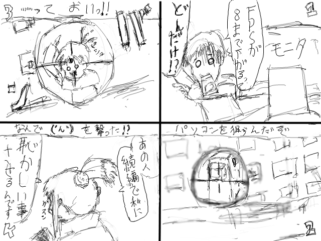 というわけで、椅子をぶんぶん振り回すようなのを描きたかったのですが、あえなく失敗したまんじゅ(´ん`)です。こんばんは。